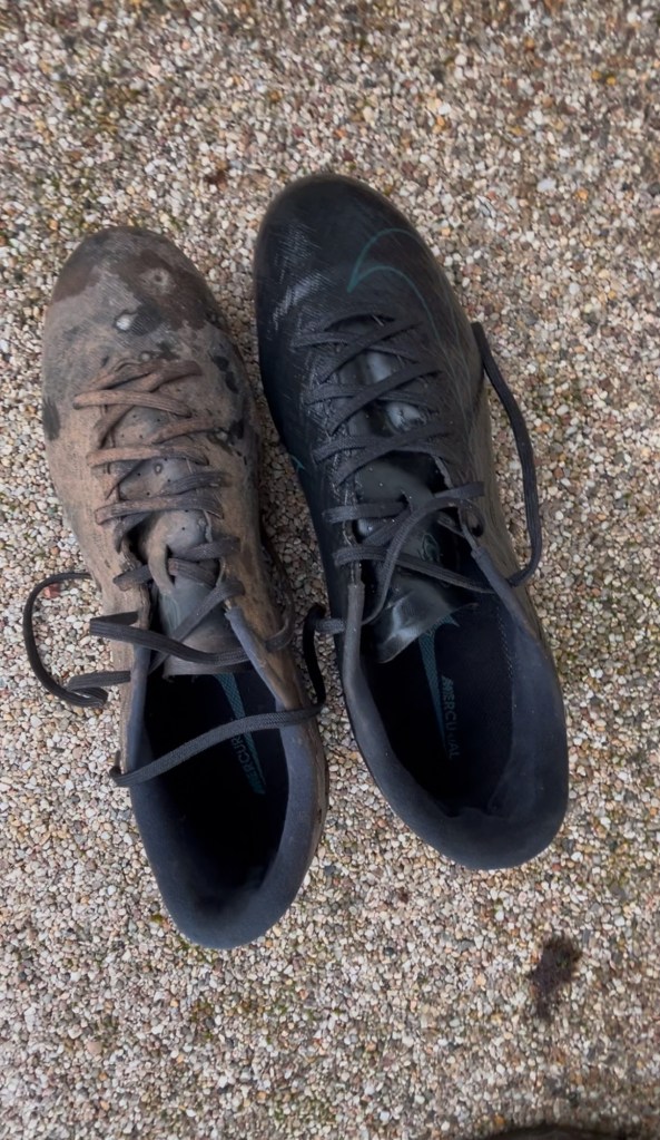 Here’s a quick comparison photo showing the difference between my rugby togs pre- and post-cleaning using the Boot Buddy boot cleaner. as you can see, there’s a clear difference and the clean boots on the right hand side are gleaming!
